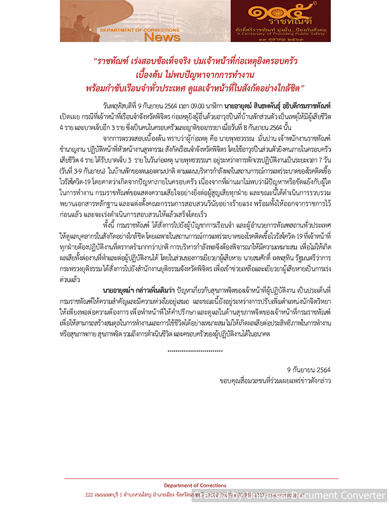 จากการตรวจสอบเบื้องต้น ทราบว่าผู้ก่อเหตุ คือ นายพุทธวรรณ เจ้าพนักงานราชทัณฑ์ชำนาญงาน ปฏิบัติหน้าที่หัวหน้างานสูทกรรม สังกัดเรือนจำจังหวัดพิจิตรโดยใช้อาวุธปืนส่วนตัวยิงคนภายในครอบครัวเสียชีวิต 4 ราย ได้รับบาดเจ็บ 3 ราย ในวันก่อเหตุ นายพุทธวรรณฯ อยู่ระหว่างการพักเวรปฏิบัติงานเป็นระยะเวลา 7 วัน(วันที่ 3-9 กันยายน) ในบ้านพักของตนเองตามปกติ ตามแผนบริหารกำลังพลในสถานการณ์การแพร่ระบาดของโรคติดเชื้อไวรัสโควิด-19 โดยคาดว่าเกิดจากปัญหาภายในครอบครัว เนื่องจากที่ผ่านมาไม่พบว่ามีปัญหาหรือขัดแย้งกับผู้ใดในการทำงาน กรมราชทัณฑ์ขอแสดงความเสียใจอย่างยิ่งต่อผู้สูญเสียทุกฝ่าย และขณะนี้ได้ดำเนินการรวบรวมพยานเอกสารหลักฐาน และแต่งตั้งคณะกรรมการสอบสวนวินัยอย่างร้ายแรง พร้อมทั้งให้ออกจากราชการไว้ก่อนแล้ว และจะเร่งดำเนินการสอบสวนให้แล้วเสร็จโดยเร็ว