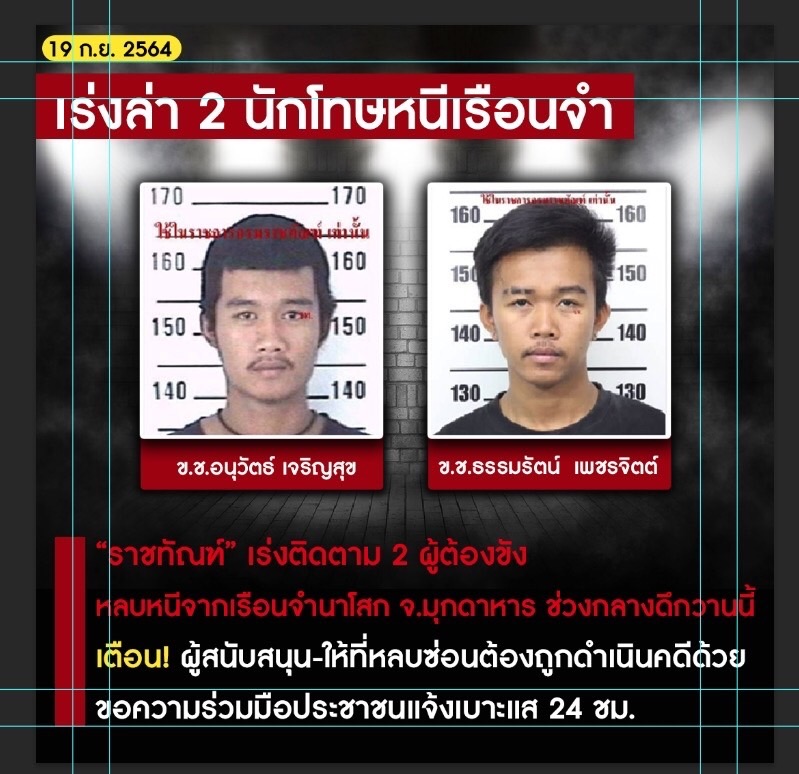 ที่กรมราชทัณฑ์ เมื่อวันที่ 19 ก.ย. กรมราชทัณฑ์ได้รับแจ้งจากนายบัณฑิตย์ เชื้อม่วง ผู้บัญชาการเรือนจำจังหวัดมุกดาหาร ว่า เมื่อเวลาประมาณ 22.30 น. วันที่ 18 ก.ย. มีผู้ต้องขังชาย 2 คน คือ ข.ชอนุวัฒน์ อายุ 30 ปี และข.ช.ธรรมรัตน์ อายุ 21 ปี ทั้งสองเป็นผู้ต้องขังคดีขับรถและเสพยาเสพติด ได้หลบหนีออกจากเรือนจำชั่วคราวนาโสก ซึ่งอยู่ภายในบริเวณเรือนจำจังหวัดมุกดาหาร