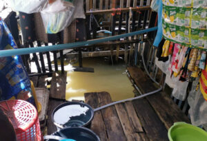 ขณะที่คุณยายวัย 84 ปี ที่อยู่ในชุมชนได้ชี้ให้ดูจุดที่ตกลงไปในน้ำจนได้รับบาดเจ็บแขนขวาหักเมื่อ2อาทิตย์ที่แล้ว เนื่องจากน้ำที่ไหลเข้าท่วมบ้านเรือนมานานจนส่งผลไม้กระดานที่พื้นเกิดผุพังเมื่อเดินไปเหยียบจึงตกลงไปโชคดีที่มีคนมาช่วยได้ทัน ขณะที่ลูกสาวได้เปิดภาพถ่ายในมือถือตอนที่น้ำไหลเข้าท่วมบ้านให้ดูซึ่งพบว่าน้ำได้ไหลเข้าท่วมภายในบ้านสูง 10-15 ซม.และอยากเรียกร้องหน่วยงานที่เกี่ยวข้องเข้ามาช่วยเหลือซ่อมแซมพื้นบ้านเพราะเกรงว่าแม่ที่อายุมากแล้วจะร่วงลงไปอีกเนื่องจากบางวันต้องอาศัยอยู่คนเดียว