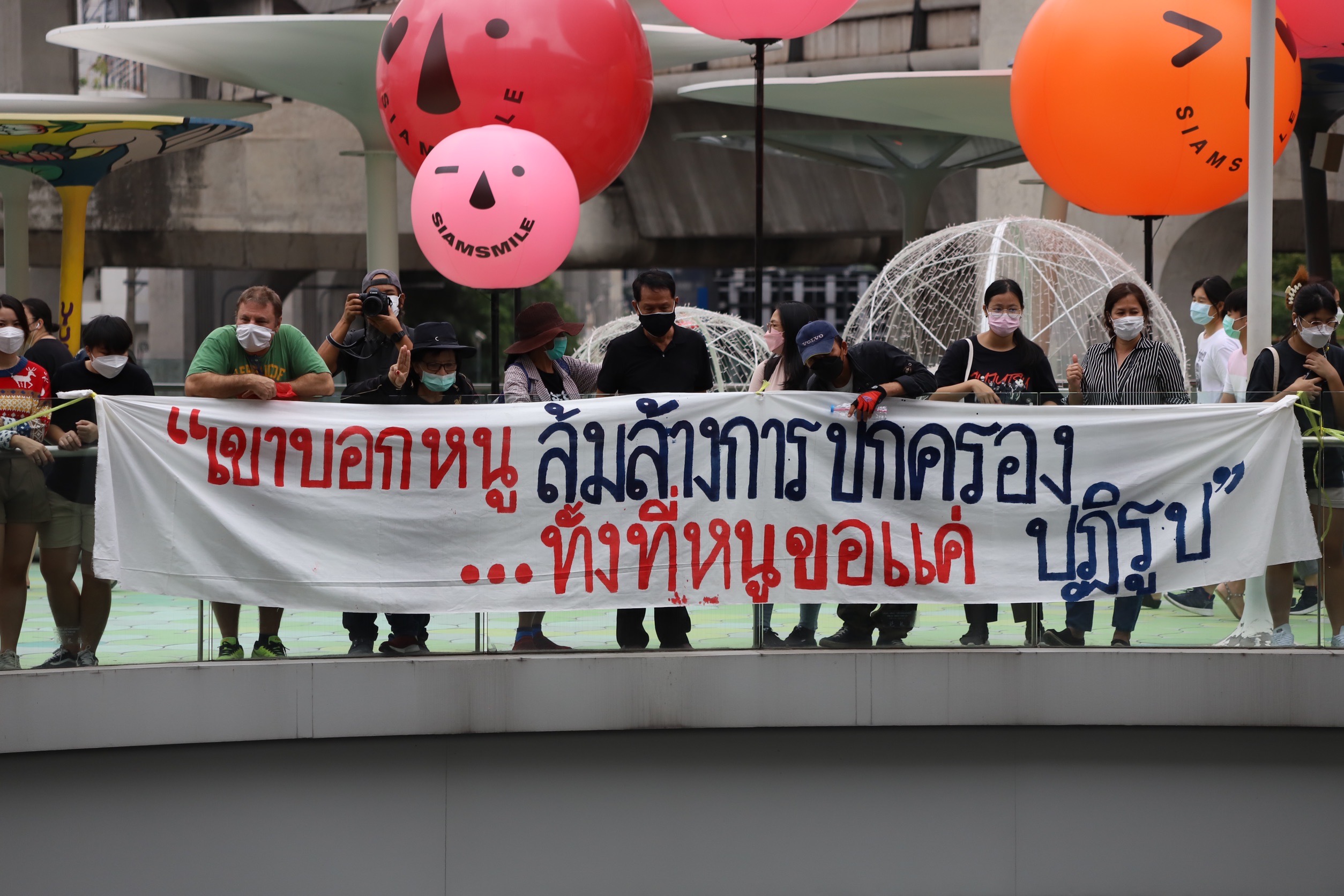 ต่อมา เวลา 16.00 น. บรรยากาศที่แยกปทุมวันพบว่า มวลชนทยอยเข้าพื้นที่อย่างต่อเนื่อง มีทั้งการแสดงดนตรีเพื่อเรียกร้องประชาธิปไตย เปิดร้านขายของพร้อมมีธงประจำกลุ่มโบกไสวระหว่างการชุมนุม รวมถึงติดป้ายข้อความ เขียนข้อความเพื่อแสดงออกเชิงสัญลักษณ์ คัดค้านคำวินิจฉัยของศาลรัฐธรรมนูญภายใต้หัวข้อ “ต่อต้านการปกครอง ต่อต้านสมบูรณาญาสิทธิราชย์” ตามวัตถุประสงค์หลักของการชุมนุม