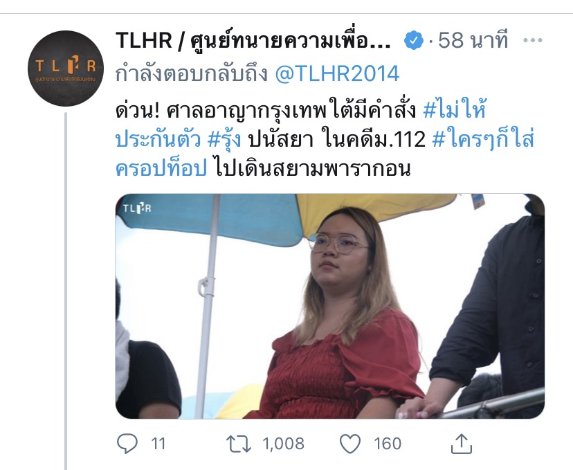 ต่อมาเวลา 17.00 น. ทวิตเตอร์ TLHR / ศูนย์ทนายความเพื่อสิทธิมนุษยชน ได้โพสต์ข้อความระบุว่า“ด่วน! ศาลอาญากรุงเทพใต้มีคำสั่งไม่ให้ประกันตัว รุ้ง ปนัสยา ในคดีม.112 #ใครๆก็ใส่ครอปท็อป ไปเดินสยามพารากอน