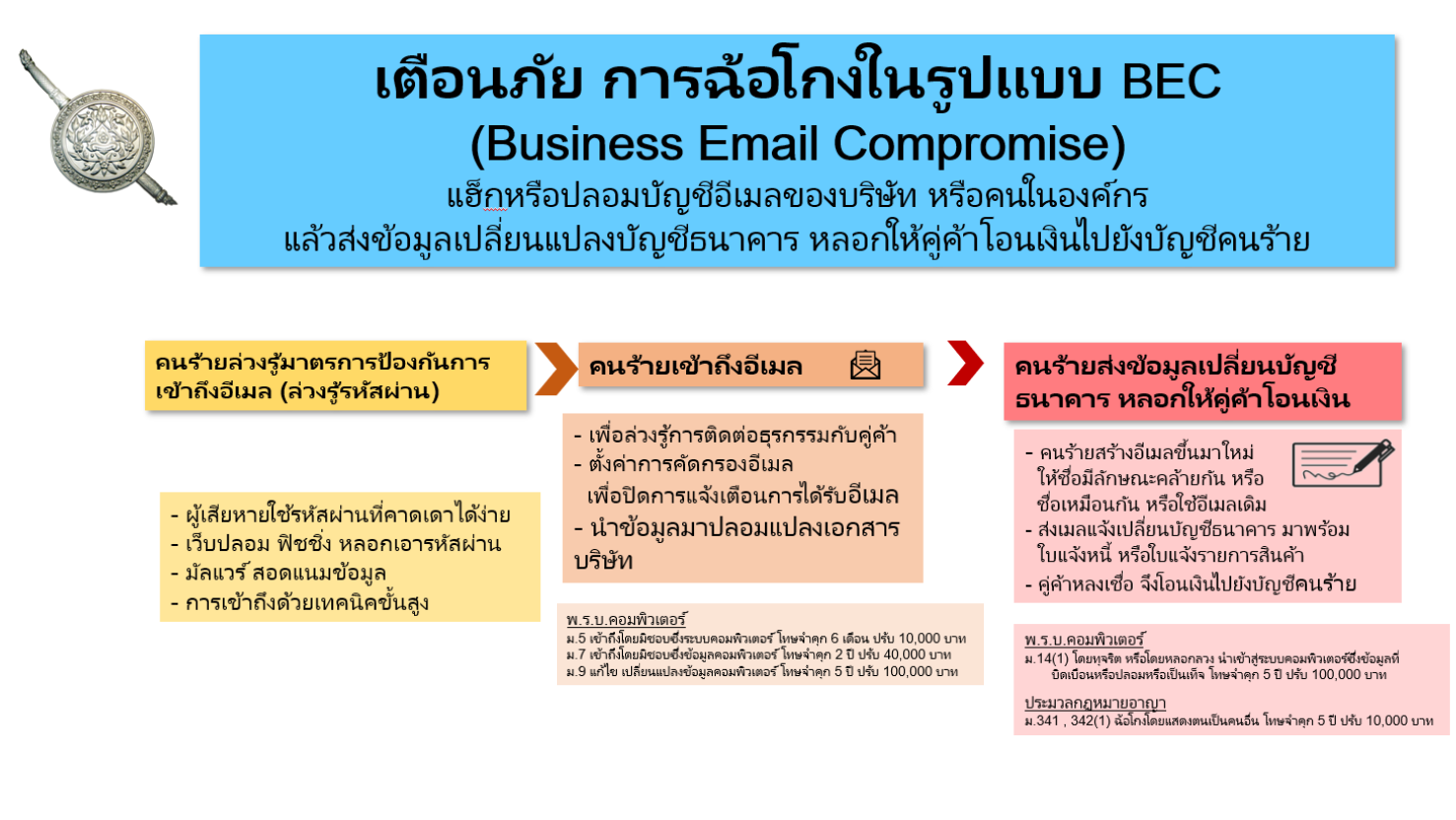 การกระทำดังกล่าวคืออาชญากรรมไซเบอร์ในรูปแบบ Business Email Compromise (BEC) หรือ การสร้างความเสียหายต่ออีเมลทางธุรกิจ ด้วยการแฮกหรือปลอมอีเมลของคู่ค้าฝ่ายใดฝ่ายหนึ่ง เพื่อสวมรอยเป็นบริษัทคู่ค้า หรือตัวแทนที่ติดต่อเจรจาทางธุรกิจ และหลอกเอาทรัพย์สิน ข้อมูล หรือผลประโยชน์อื่น ๆ โดยไม่ชอบด้วยกฎหมาย ทางตร.จึงขอประชาสัมพันธ์และแจ้งเตือนประชาชน โดยเฉพาะบริษัทที่ใช้การติดต่อธุรกิจผ่านทางอีเมล ให้ใช้ความระมัดระวังในการโอนเงินหรือส่งมอบสินค้า และหากมีการแจ้งเปลี่ยนการชำระเงิน หรือสถานที่ส่งสินค้า ให้ติดต่อกับคู่ค้าโดยตรงนอกเหนือจากทางอีเมล รวมถึงเน้นย้ำการให้ความรู้แก่บุคลากรภายในองค์กร เพื่อลดความเสี่ยงถูกโจมตีในรูปแบบ BEC