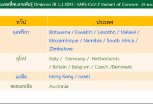 นายแพทย์เฉวตสรร นามวาท ผู้อำนวยการกองควบคุมโรคและภัยสุขภาพในภาวะฉุกเฉิน กรมควบคุมโรค แถลงสถานการณ์ในประเทศไทย ว่า วันนี้มีผู้ป่วยรักษาหาย 6,165 ราย ผู้ติดเชื้อรายใหม่ 4,753 ราย และเสียชีวิต 27 ราย แนวโน้มผู้ติดเชื้อลดลงต่อเนื่อง ส่วนการฉีดวัคซีนโควิด 19 ข้อมูลถึงวันที่ 28 พฤศจิกายน 2564 ฉีดแล้ว 92,360,417 โดส เข็มที่ 1 ครอบคลุม 66% ของประชากร ส่วนสถานการณ์การแพร่ระบาดของสายพันธุ์โอไมครอน นอกจากทวีปแอฟริกา 8 ประเทศ ได้แก่ นามิเบีย ซิมบับเว บอตสวานา เลโซโท เอสวาตินี โมซัมบิก แอฟริกาใต้ มาลาวี มีรายงานพบในทวีปยุโรป ได้แก่ อิตาลี เยอรมัน เนเธอร์แลนด์ อังกฤษ เบลเยียม สาธารณรัฐเช็ก และเดนมาร์ก ทวีปเอเชียพบใน ฮ่องกง และอิสราเอล และทวีปออสเตรเลีย พบในประเทศออสเตรเลีย