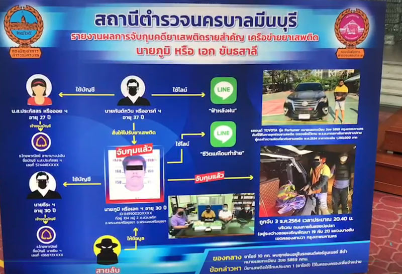 พล.ต.ท.สำราญ นวลมา ผู้บัญชาการตำรวจนครบาล แถลงการจับกุม นายภูมิ หรือเอก ขันธสาลี อายุ 30 ปี พร้อมของกลางยาไอซ์จำนวน 10 กิโลกรัม มูลค่ากว่า 1,250,000 บาท (ซุกซ่อนอยู่ในกระสอบพลาสติกลายสายรุ้งอยู่ภายในรถยนต์ TOYOTA รุ่น Fortuner