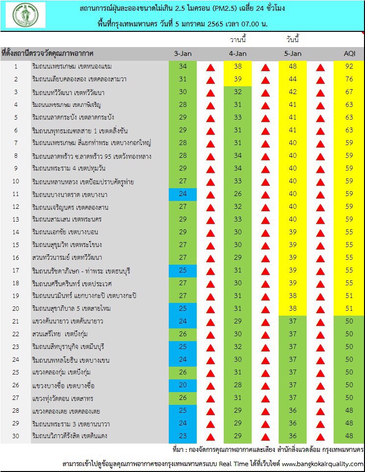ศูนย์ประสานงานและแก้ไขปัญหามลพิษทางอากาศในกรุงเทพมหานครรายงานสถานการณ์ฝุ่นละอองขนาดไม่เกิน 2.5 ไมครอน (PM 2.5) ของสถานีตรวจวัดคุณภาพอากาศของกรุงเทพมหานคร ประจำวันพุธที่ 5 มกราคม พ.ศ. 2565 เวลา 07.00 น. ค่าเฉลี่ย 24 ชั่วโมง ของฝุ่นละอองขนาดไม่เกิน 2.5 ไมครอน (PM2.5) ตรวจวัดได้ 23-48 ไมโครกรัม/ลูกบาศก์เมตร (มคก./ลบ.ม.) พบว่าไม่เกินมาตรฐานทุกพื้นที่ที่มีการตรวจวัด (มาตรฐานไม่เกิน 50 มคก./ลบ.ม.)