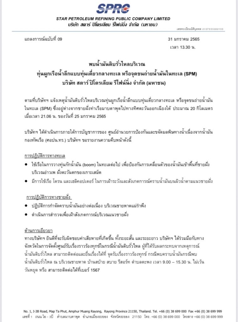 บริษัท สตาร์ ปิโตรเลียม รีไฟน์นิ่ง จำกัด (มหาชน) (SPRC) ออกแถลงการณ์ฉบับที่ 9 ประจำวันที่ 31 ม.ค. 2565 เวลา 13.30 น. พบน้ำมันดิบรั่วไหลบริเวณ ทุ่นผูกเรือน้ำลึกแบบทุ่นเดียวกลางทะเล หรือจุดขนถ่ายน้ำมันในทะเล (SPM)