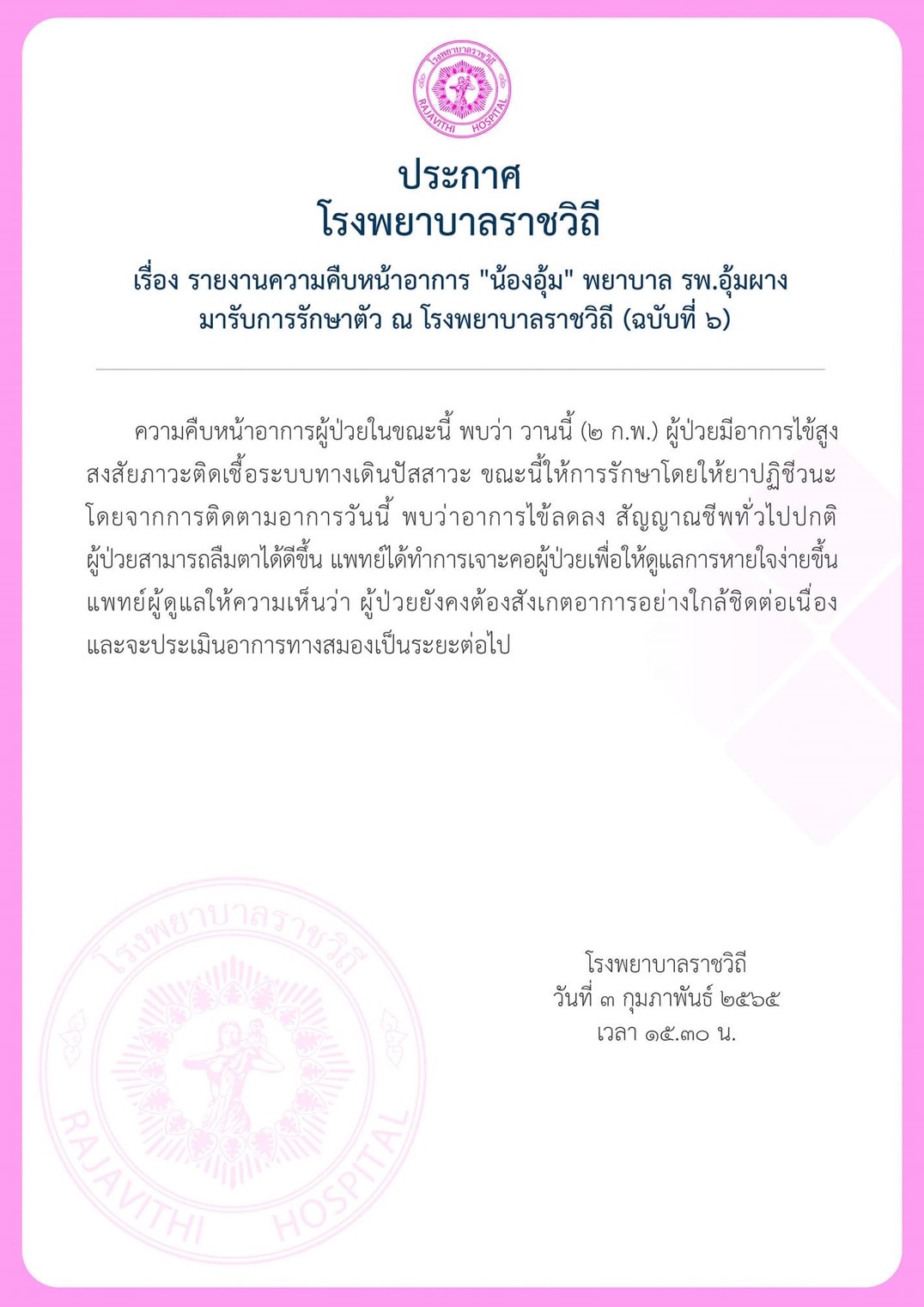 วันนี้ ( 3 ก.พ.65) โรงพยาบาลราชวิถี ออกประกาศ เรื่องอัพเดตอาการ น้องอุ้ม พยาบาลสาวอุ้มผาง มารับการรักษาตัว ณ โรงพยาบาลราชวิถี ฉบับที่ 6โดยข้อความระบุว่า “ความคืบหน้าอาการผู้ป่วยในขณะนี้ พบว่า วานนี้ (2 ก.พ.) ผู้ป่วยมีอาการไข้สูง สงสัยภาวะติดเชื้อระบบทางเดินปัสสาวะ ขณะนี้ให้การรักษาโดยให้ยาปฏิชีวนะ โดยจากการติดตามอาการวันนี้ พบว่าอาการไข้ลดลง สัญญาณชีพทั่วไปปกติ ผู้ป่วยสามารถลืมตาได้ดีขึ้น แพทย์ได้ทำการเจาะคอผู้ป่วยเพื่อให้ดูแลการหายใจง่ายขึ้น แพทย์ผู้ดูแลให้ความเห็นว่า ผู้ป่วยยังคงต้องสังเกตอาการอย่างใกล้ชิดต่อเนื่อง และจะประเมินอาการทางสมองเป็นระยะต่อไป”