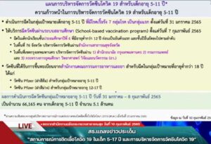 นพ.วิชาญ ปานวัน ผู้อำนวยการกองโรคติดต่อทั่วไป กรมควบคุมโรค ความคืบหน้าการฉีดวัคซีน การเปรียบเทียบการติดเชื้อในเด็ก เห็นว่า ระลอกหลัง สายพันธุ์เดลตา โอไมครอน 5-11 ปี พบการติดเชื้อเพิ่มขึ้นร้อยละ 6 ถือว่า สูงขึ้นมาก แม้ว่าเด็กจะติดเชื้อโควิดเพิ่มมากขึ้น แต่อาการค่อนข้างน้อย และสิ่งที่น่าเป็นห่วง หลังจากเด็กติดโควิด นั่นคือ อาการ MIS-C หรือ กลุ่มอาการอักเสบหลายระบบในเด็ก เป็นภาวะหลังจากที่เด็กติดโควิด-19 แล้ว เกิดอาการอักเสบในอวัยวะต่างๆ ทั่วร่างกาย ดังนั้น จึงจำเป็นต้องนำวัคซีนมาฉีดให้กับเด็ก โดย ได้ดำเนินการฉีดวัคซีนให้กับเด็กกลุ่ม 5-11 ปี ตั้งแต่วันที่ 31 มกราคม- 8 กมุภาพันธ์ 2565 ได้ฉีดให้เด็กไปแล้วก 66,156 คน จากเด็กในช่วงอายุเดียวกันที่มีจำนวนกว่า 5.1 ล้านคนทั้งนี้ กระทรวงสาธารณสุข ยืนยันว่า ในการนำวัคซีนมาฉีดให้กับเด็ก นั้น ได้พิจารณาในหลายด้าน มีการพิจารณาโดยคณะกรรมการ ซึ่งเป็นผู้เชี่ยวชาญในหลายภาคส่วน ก่อนจะนำมากำหนดเป็นแนวทางว่า ควรฉีดวัคซีนประเภทไหน สูตรไหน เพื่อความปลอดภัยของเด็กให้มากที่สุด
