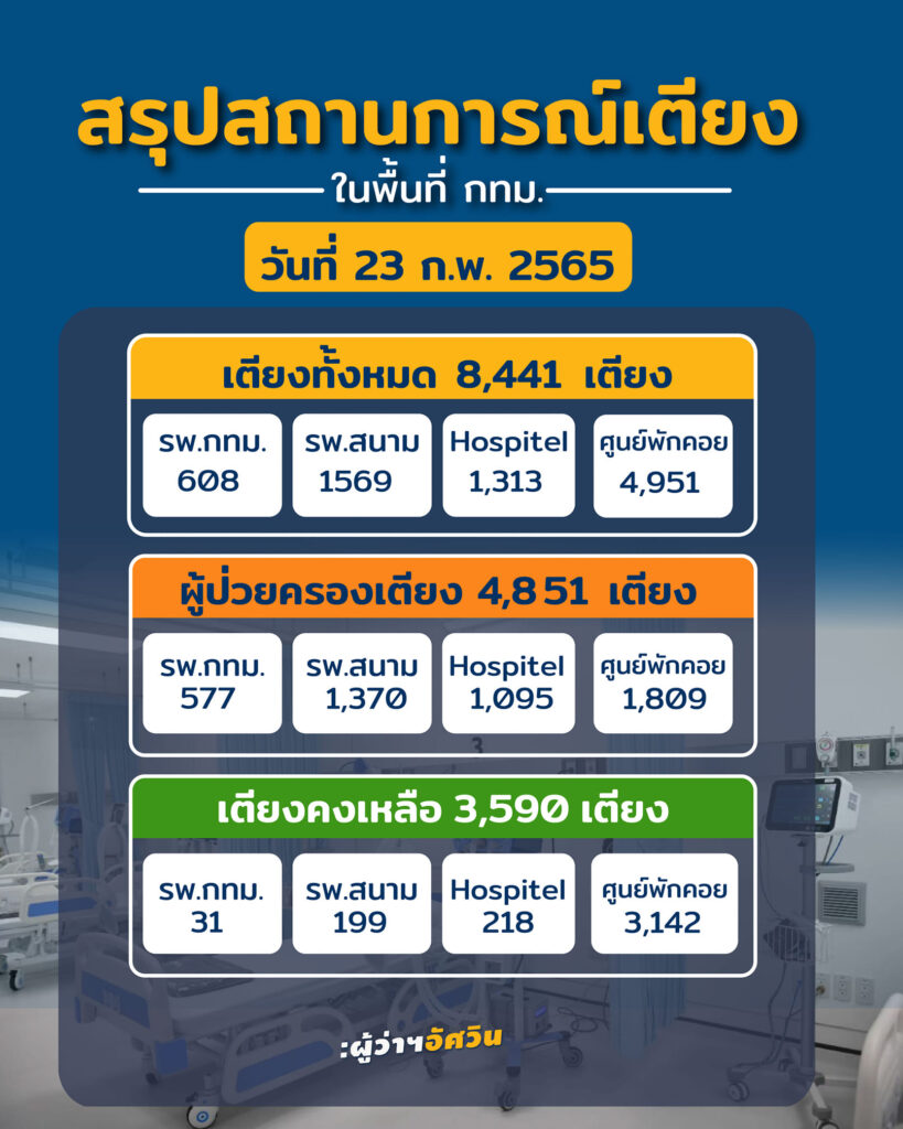 วันนี้ (23 ก.พ. 65) พล.ต.อ.อัศวิน ขวัญเมือง ผู้ว่าราชการกรุงเทพมหานคร ได้เผยแพร่ผ่านเฟซบุ๊ก กรณีสถานการณ์เตียงรักษาผู้ป่วยโรคโควิด-19 ในกรุงเทพมหานคร ประจำวันที่ 23 ก.พ. 65 ว่า เตียงรองรับผู้ป่วย ประกอบด้วย รพ.สังกัด กทม. 9 แห่ง รพ.สนาม 7 แห่ง Hospitel 4 แห่ง ศูนย์พักคอย (CI) เปิดดำเนินการแล้ว 31 แห่ง และเปิดเพิ่มเติมอีก 9 แห่ง (รวม 4,951 เตียง) รวมทั้งสิ้น 8,441 เตียง มีผู้ป่วยครองเตียง 4,851 ราย คงเหลือ 3,590 เตียง อัตราครองเตียงคิดเป็นร้อยละ 57.47 ของจำนวนเตียงทั้งหมด