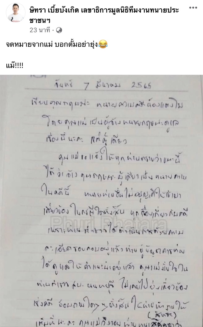 “ทนายตั้ม” โพสต์เฟซ แม่ ”แตงโม” ร่อนจดหมายถึง วอนอย่ายุ่งคดี ลั่นไม่ได้จ้าง