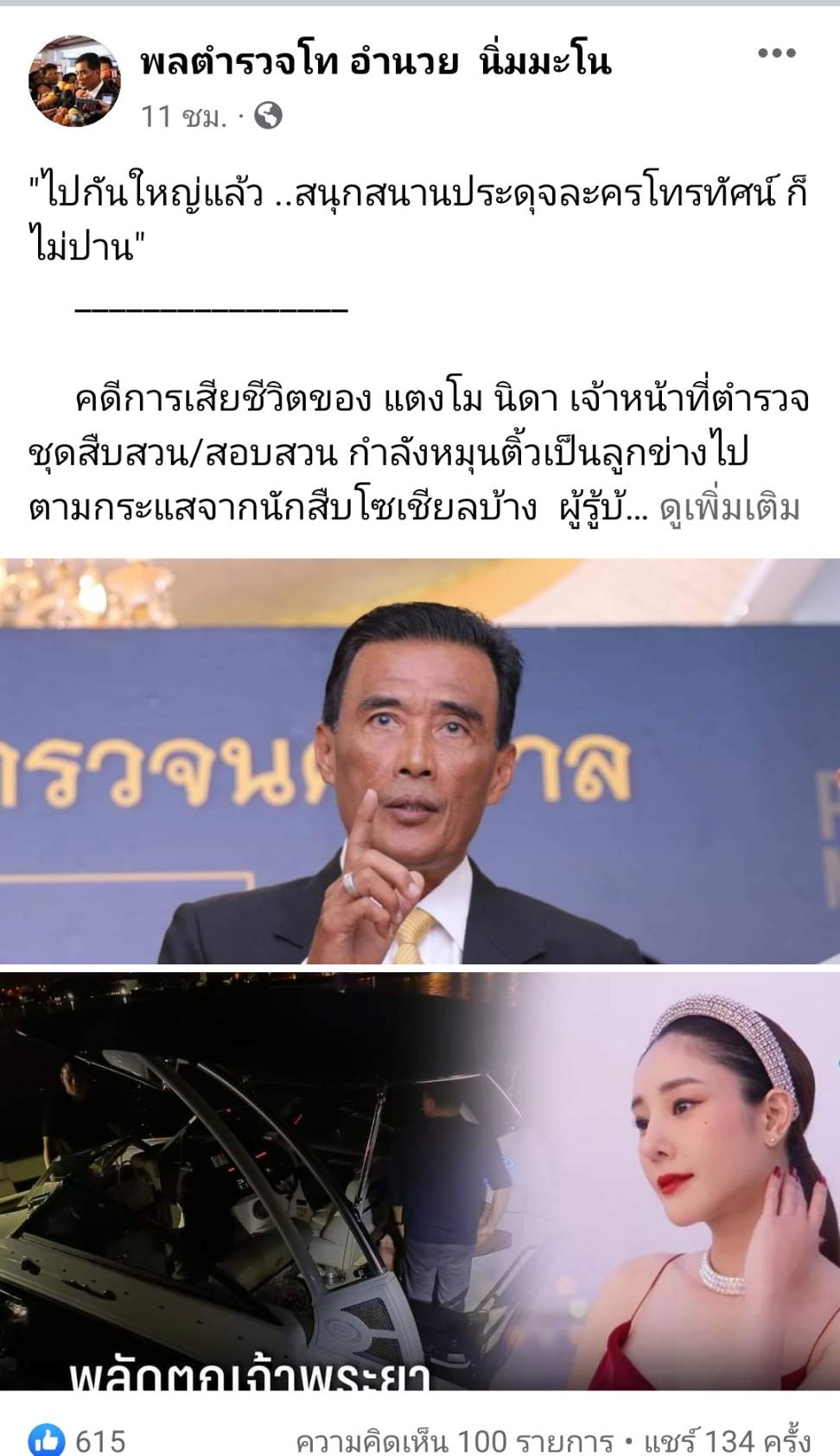 พล.ต.ท. อำนวย นิ่มมะโน กรรมการปฏิรูปประเทศด้านกระบวนการยุติธรรม โพสต์ข้อความผ่านเฟซบุ๊กส่วนตัว “พลตำรวจโท อำนวย นิ่มมะโน” แสดงความคิดเห็นเกี่ยวกับคดีการเสียชีวิตของ น.ส.ภัทรธิดา พัชรวีระพงษ์ หรือแตงโม นิดา โดยระบุว่า คดีการเสียชีวิตของ แตงโม นิดา เจ้าหน้าที่ตำรวจชุดสืบสวน/สอบสวน กำลังหมุนติ้วเป็นลูกข่างไปตามกระแสจากนักสืบโซเชียลบ้าง ผู้รู้บ้าง ไม่รู้บ้าง อวดรู้บ้าง คาดเดาเต้าเรื่องบ้าง สร้างประเด็น ข้อสงสัย ข้อกังขา ข้อเรียกร้องความสนใจให้เกิดขึ้นในสังคม ต่างๆ นานา บางประเด็นถึงขนาดหมิ่นประมาทผู้เสียชีวิตก็มี