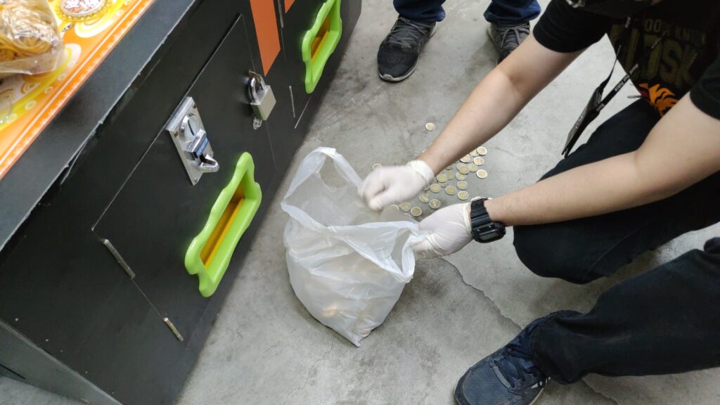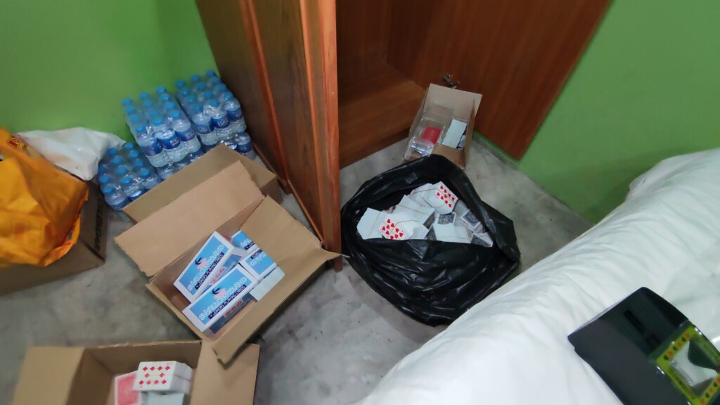 จากการตรวจสอบพบด้านในมีห้องต่างๆจำนวนมาก โดยจุดที่พบว่าเป็นจุดที่มีการลักลอบเล่นการพนันด้านในแบ่งเป็นห้องย่อยจำนวน 6 ห้อง แต่ไม่พบผู้เล่น พบเพียงอุปกรณ์การพนันจำนวนหนึ่ง พบโต๊ะเสือมังกร 1 โต๊ะ, โต๊ะไฮโล 1 โต๊ะ, ตู้เกมส์อิเล็กทรอนิกจำนวน 2 ตู้, ตู้เกมส์ปลาอิเล็กทรอนิกจำนวน 2 ตู้, โต๊ะใช้สำหรับเล่นไพ่ 1 ตัว, ไพ่จำนวนหนึ่ง, กล่องไพ่ที่ยังไม่ได้ใช้และไพ่ที่ใช้แล้วจำนวนมาก, เครื่องสลับไพ่ 1 เครื่องและ โต๊ะคลุมผ้าเขียว 2 ตัว เจ้าหน้าที่จึงทำการตรวจยึดมายังสน.ดอนเมือง