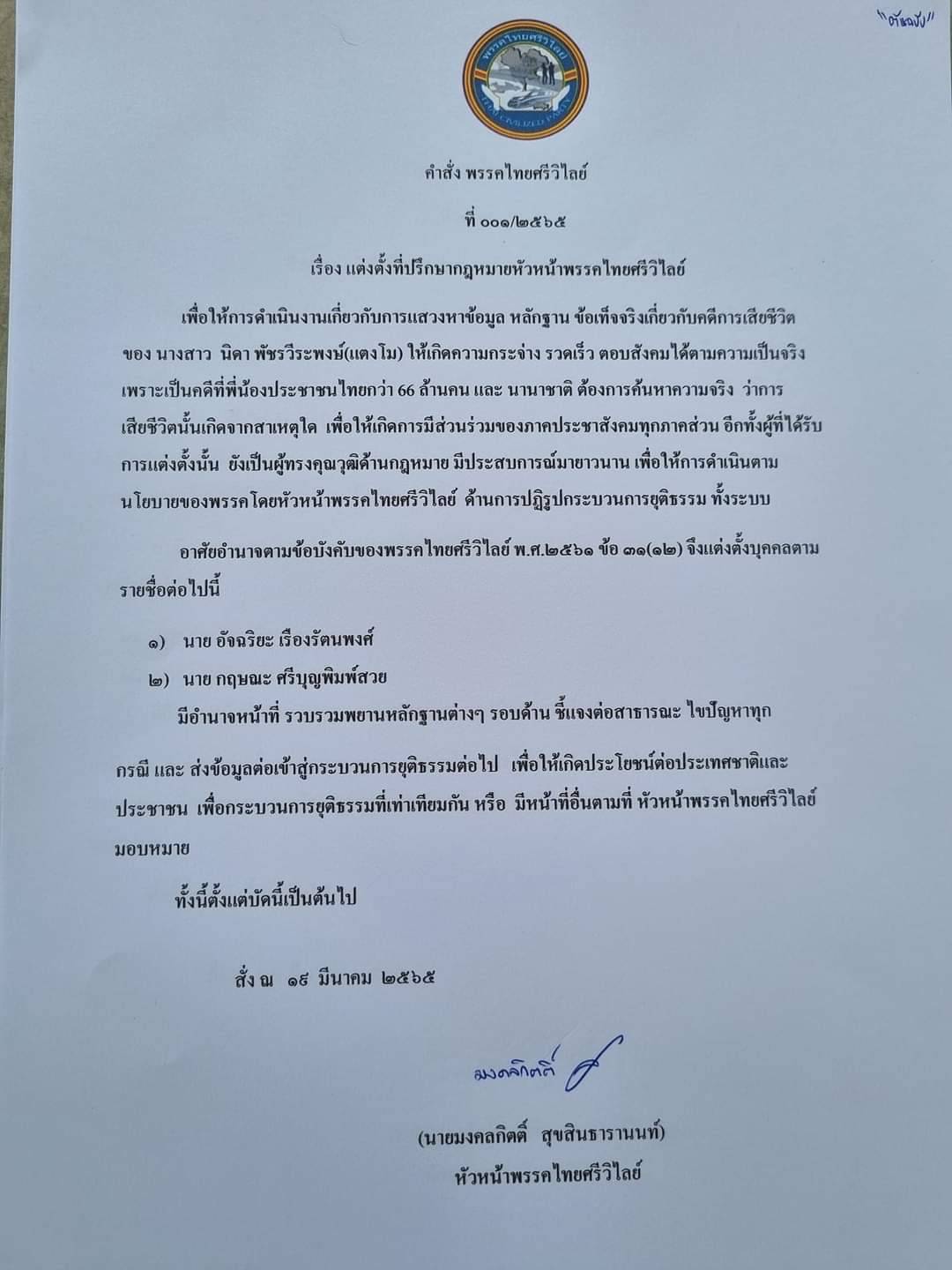 นายมงคลกิตติ์ สุขสินธารานนท์ หัวหน้าพรรคไทยศรีวิไลย์ มีหนังสือคำสั่ง พรรคไทยศรีวิไลย์ ที่ 001/2565 เรื่อง แต่งตั้งที่ปรึกษากฎหมายหัวหน้าพรรคไทยศรีวิไลย์