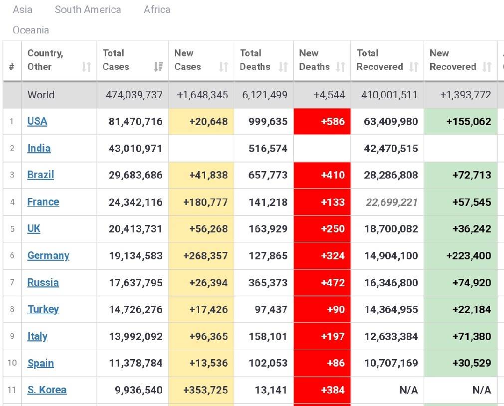 เว็บไซต์ worldometers รายงานสถานการณ์โควิด-19 ประจำวันที่ 23 มีนาคม 2565 ช่วงเวลาประมาณ 07.20 น. ตามเวลาประเทศไทย พบผู้ติดเชื้อทั่วโลก 474,039,737 ราย เพิ่มขึ้น 1,648,345 ราย เสียชีวิต 6,121,499 ราย เพิ่มขึ้น 4,544ราย รักษาหาย 410,001,511 ราย เพิ่มขึ้น 1,393,772 ราย