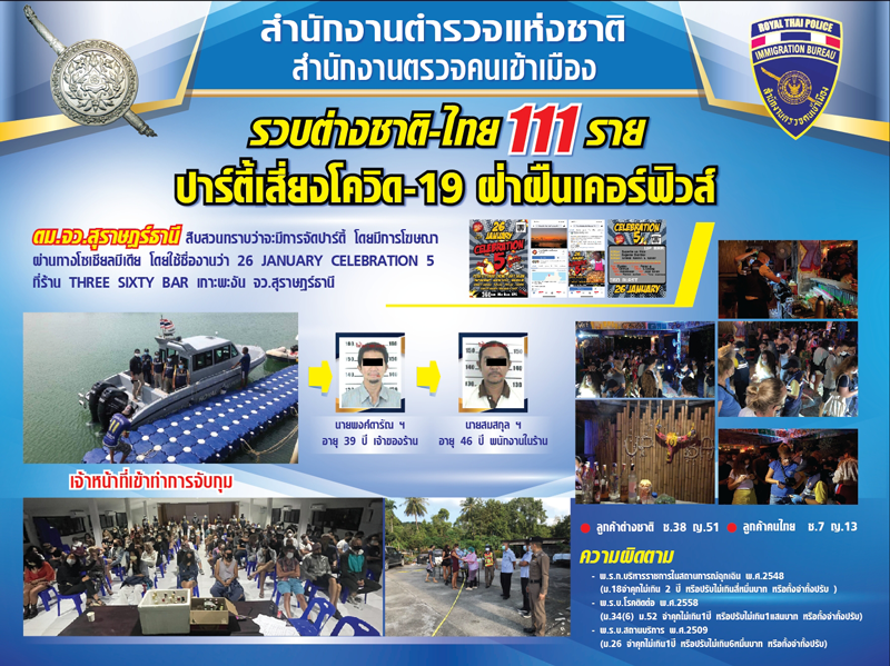 พล.ต.อ.สุวัฒน์ แจ้งยอดสุข ผู้บัญชาการตำรวจแห่งชาติ แถลงผลการจับกุมชาวต่างชาติ คนไทย 111 คน ร่วมปาร์ตี้เสี่ยงโควิด-19 หลังตำรวจตรวจคนเข้าเมืองจังหวัดสุราษฎร์ธานี ได้รับแจ้งว่าร้านอาหารแห่งหนึ่งใน อ.เกาะพะงัน จ.สุราษฎร์ธานี มีการจัดปาร์ตี้วันครบรอบ 5 ปีของร้าน คิดค่าเข้าบริการรายละ 100 บาท โดยจัดสถานที่เป็นสถานบันเทิงและจำหน่ายอาหาร เครื่องดื่มแอลกอฮอล์ให้กับลูกค้าชาวต่างชาติและคนไทย ซึ่งเสี่ยงต่อการแพร่ระบาดของเชื้อโควิด