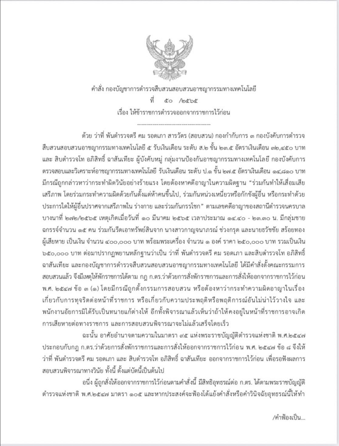 พล.ต.ท.กรชัย คล้ายคลึง ผู้บัญชาการตำรวจสืบสวนสอบสวนอาชญากรรมทางเทคโนโลยี(ผบช.สอท.) ลงนามในคำสั่งบช.สอท.ที่ 50/2565 ลงวันที่ 2 เม.ย.2565 ให้ พ.ต.ต.คม รอดเภา (สอบสวน) กองกำกับการ 3 กองบังคับการตำรวจสืบสวนสอบสวนอาชญากรรมทางเทคโนโลยี 5 และ ส.ต.ต.อภิสิทธิ์ ฉาสันเทียะ ผู้บังคับหมู่ กลุ่มงานป้องกันอาชญากรรมทางเทคโนโลยี กองบังคับการตรวจสอบและวิเคราะห์อาชญากรรมทางเทคโนโลยี ออกจากราชการไว้ก่อน เพื่อรอฟังผลการสอบสวนพิจารณาทางวินัย