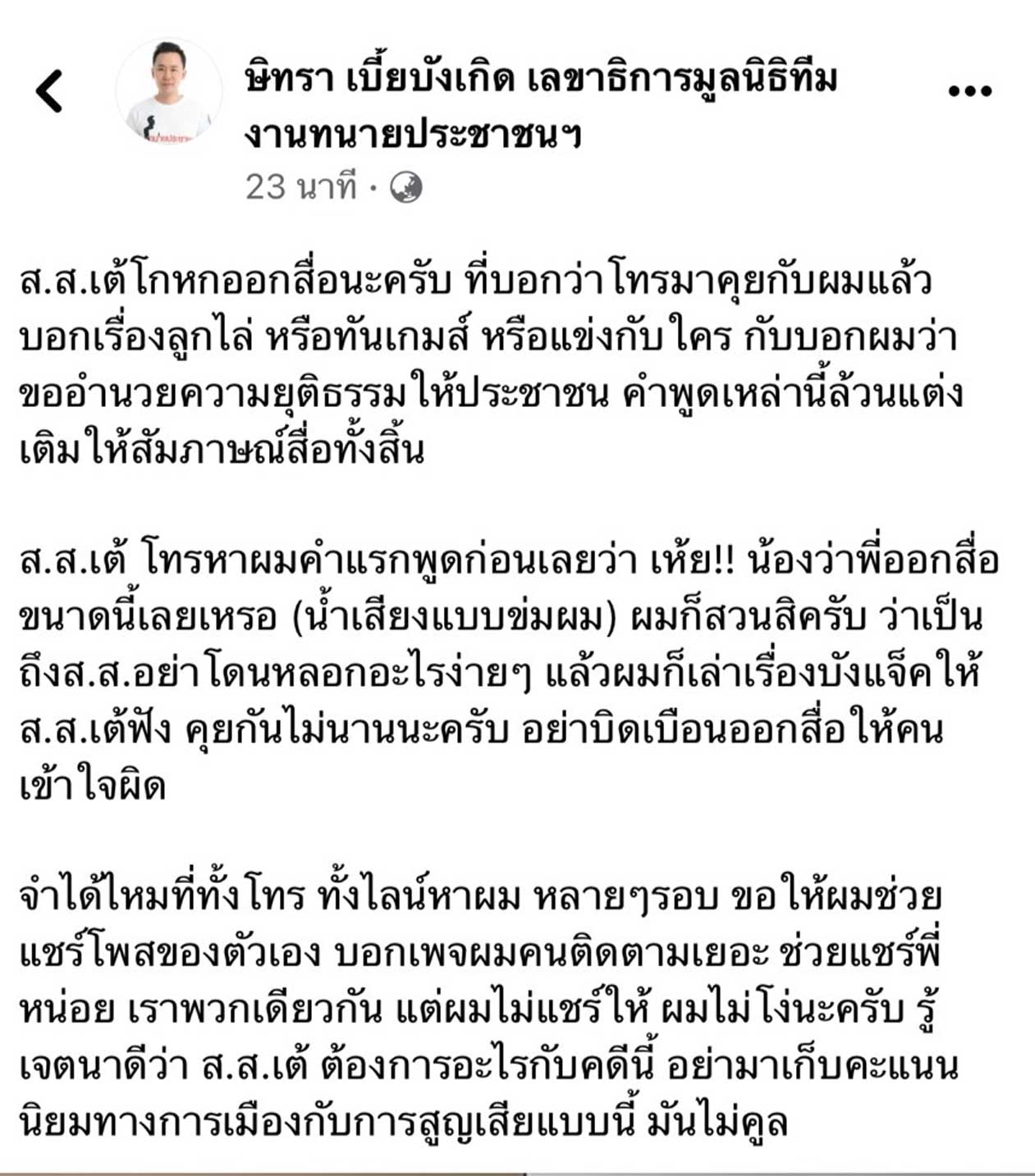 จำได้ไหมที่ทั้งโทร ทั้งไลน์หาผม หลายๆรอบ ขอให้ผมช่วยแชร์โพสของตัวเอง บอกเพจผมคนติดตามเยอะ ช่วยแชร์พี่หน่อย เราพวกเดียวกัน แต่ผมไม่แชร์ให้ ผมไม่โง่นะครับ รู้เจตนาดีว่า ส.ส.เต้ ต้องการอะไรกับคดีนี้ อย่ามาเก็บคะแนนนิยมทางการเมืองกับการสูญเสียแบบนี้ มันไม่คูล