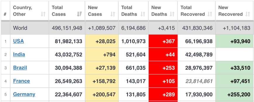 ทั่วโลกติดเชื้อโควิดกว่า 496.1 ล้านราย เพิ่ม 1 ล้านราย สหรัฐยอดติดเชื้อ 2.8 หมื่นรายต่อวัน ไทยอยู่อันดับที่ 28