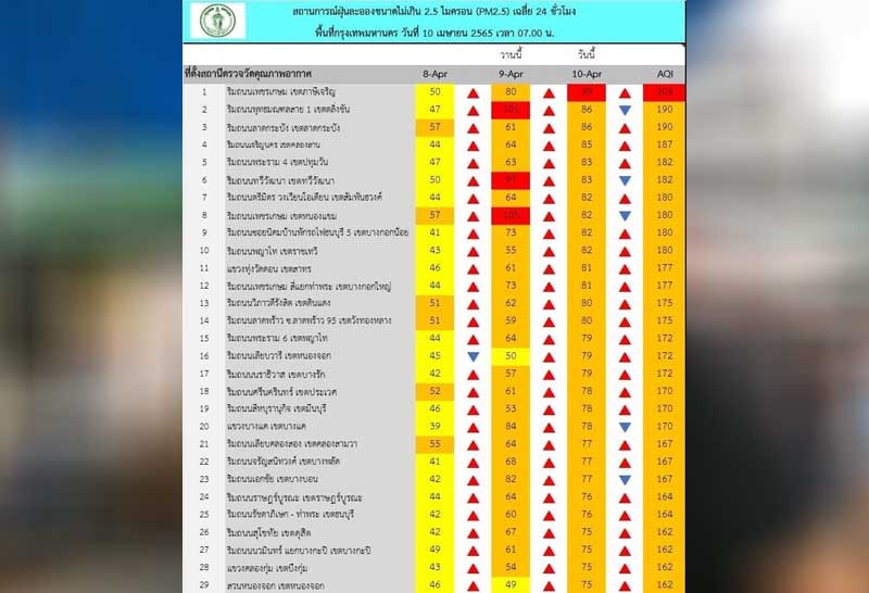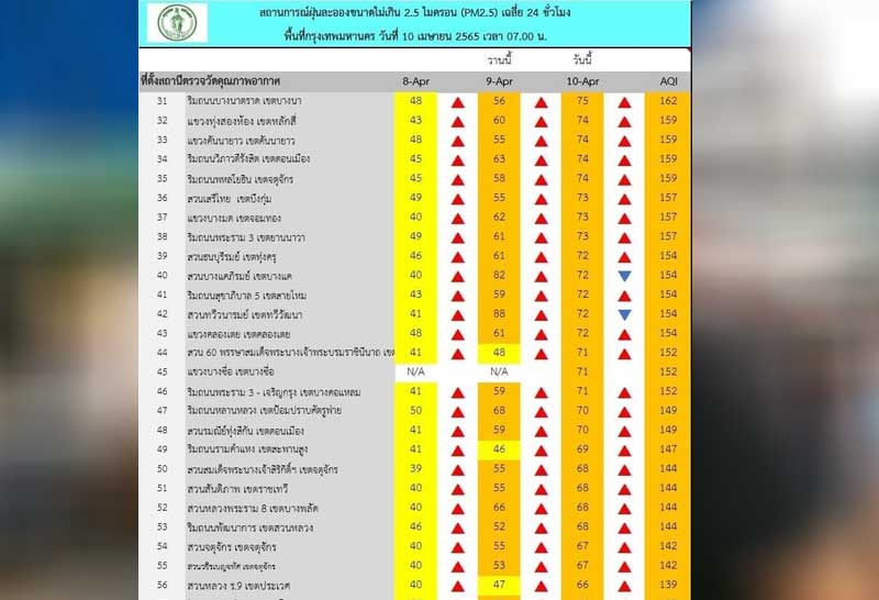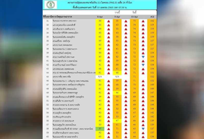 วันนี้ (10 เม.ย. 65) ศูนย์ประสานงาน และแก้ไขปัญหามลพิษทางอากาศกรุงเทพมหานคร รายงานสถานการณ์ฝุ่นละอองขนาดไม่เกิน 2.5 ไมครอน (PM 2.5) ของสถานีตรวจวัดคุณภาพอากาศกรุงเทพมหานคร เวลา 07.00 น. ค่าเฉลี่ย 24 ชั่วโมง ของฝุ่นละอองขนาดไม่เกิน 2.5 ไมครอน (PM2.5) ตรวจวัดได้ 58-99 ไมโครกรัม/ลูกบาศก์เมตร (มคก./ลบ.ม.) พบว่าเกินมาตรฐาน (มาตรฐานไม่เกิน 50 มคก./ลบ.ม.) จำนวน 68 พื้นที่ ดัชนีคุณภาพอากาศส่วนใหญ่อยู่ในระดับคุณภาพอากาศเริ่มมีผลต่อสุขภาพ