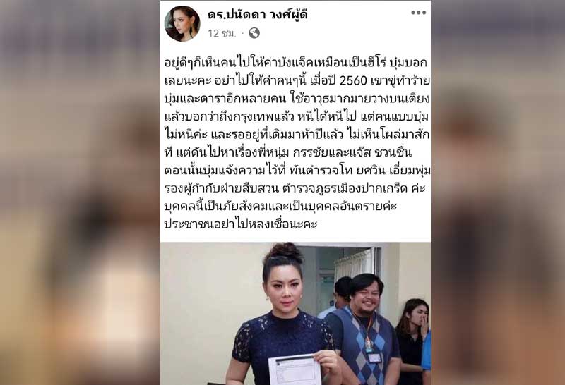 “บุ๋ม ปนัดดา” โพสต์FBอย่าให้ค่า”บังแจ็ค” ชี้เป็นภัยสังคมและเป็นบุคคลอันตรายเตือนอย่าหลงเชื่อ