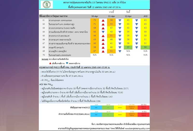 ศูนย์ประสานงานและแก้ไขปัญหามลพิษทางอากาศในกรุงเทพมหานครขอรายงานสถานการณ์ฝุ่นละอองขนาดไม่เกิน 2.5 ไมครอน (PM 2.5) ของสถานีตรวจวัดคุณภาพอากาศของกรุงเทพมหานคร ประจำวันอังคารที่ 12 เม.ย. 65 เวลา 07.00 น. ค่าเฉลี่ย 24 ชั่วโมง ของฝุ่นละอองขนาดไม่เกิน 2.5 ไมครอน (PM2.5)ตรวจวัดได้ 37-78 ไมโครกรัม/ลูกบาศก์เมตร (มคก./ลบ.ม.) พบว่าเกินมาตรฐาน (มาตรฐานไม่เกิน 50 มคก./ลบ.ม.) จำนวน 18 พื้นที่ คือ