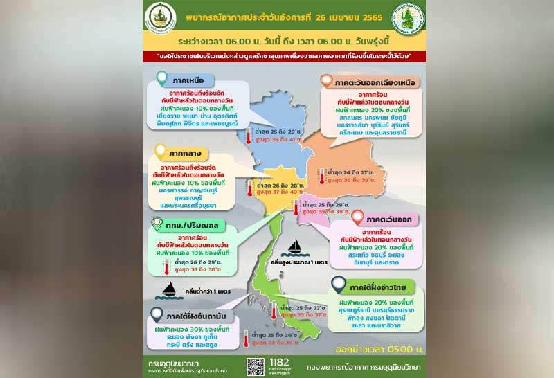 พยากรณ์อากาศ วันที่ 26 เมษายน 2565 ลักษณะอากาศทั่วไป 24 ชั่วโมงข้างหน้า หย่อมความกดอากาศต่ำเนื่องจากความร้อนปกคลุมประเทศไทยตอนบน ลักษณะเช่นนี้ทำให้บริเวณดังกล่าวมีอากาศร้อนโดยทั่วไปกับมีฟ้าหลัวในตอนกลางวัน และมีอากาศร้อนจัดบางพื้นที่ในภาคเหนือและภาคกลาง ขอให้ประชาชนดูแลสุขภาพเนื่องจากสภาพอากาศที่ร้อนขึ้นในระยะนี้ไว้ด้วย