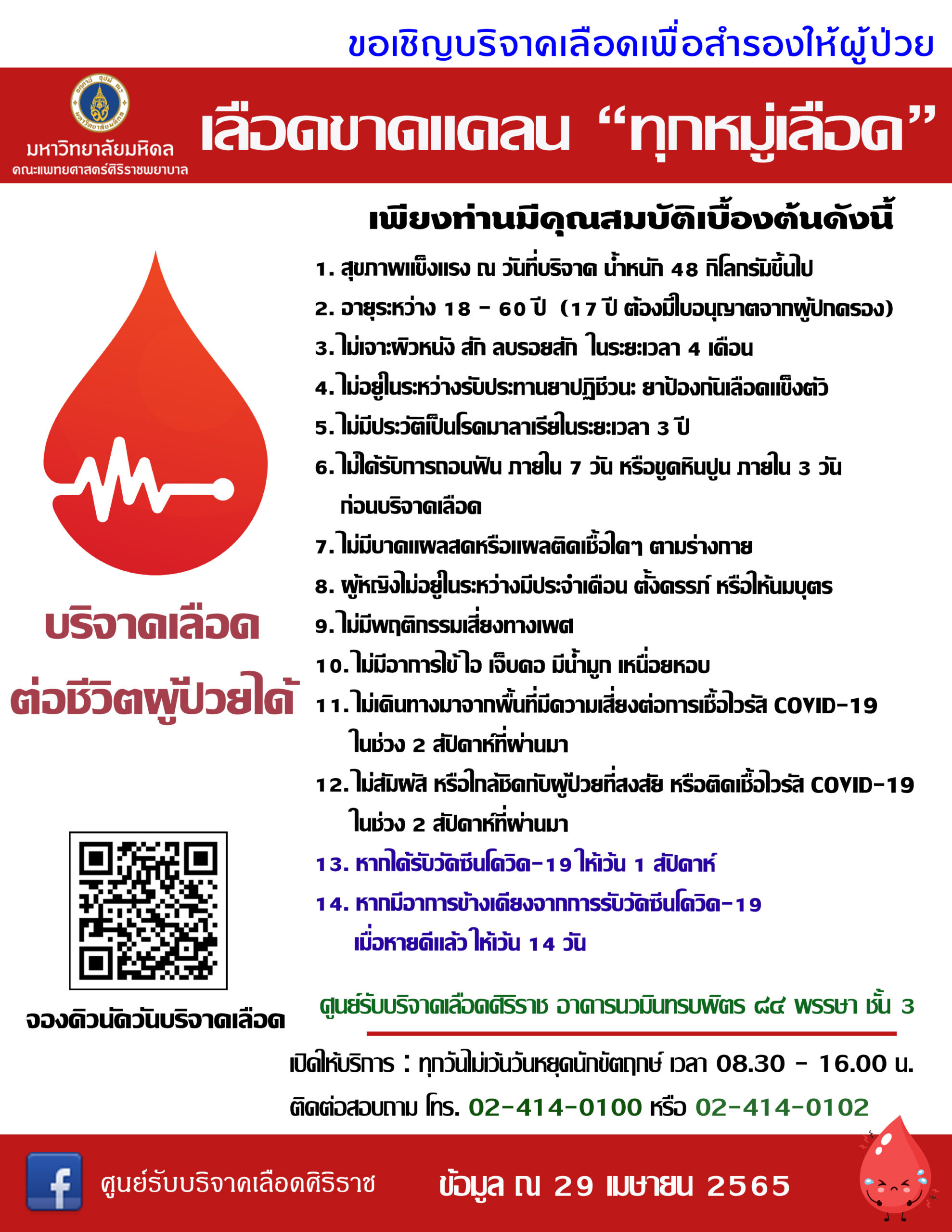 ในกรณีผู้ที่ได้รับการฉีดวัคซีน COVID-19 ขอให้งดเว้น 7 วัน หากมีอาการข้างเคียงขอให้งดเว้น 14 วันหลังไม่มีอาการ จึงสามารถมาบริจาคเลือดได้ สามารถติดต่อบริจาคเลือดได้ทุกวันที่ ศูนย์รับบริจาคเลือดศิริราช อาคารนวมินทรบพิตร ๘๔ พรรษา ชั้น 3 รพ.ศิริราช เวลา 08.30 – 16.00 น. สอบถามเพิ่มเติมได้ที่ โทร. 0 2414 0100, 0 2414 0102 (ในวันและเวลาทำการ)