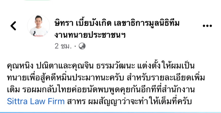 “คุณหนิง ปณิตา และคุณจิน ธรรมวัฒนะ แต่งตั้งให้ผมเป็นทนายเพื่อสู้คดีหมิ่นประมาทนะครับ สำหรับรายละเอียดเพิ่มเติม รอผมกลับไทยค่อยนัดพบพูดคุยกันอีกทีที่สำนักงาน Sittra Law Firm สาทร ผมสัญญาว่าจะทำให้เต็มที่ครับ”