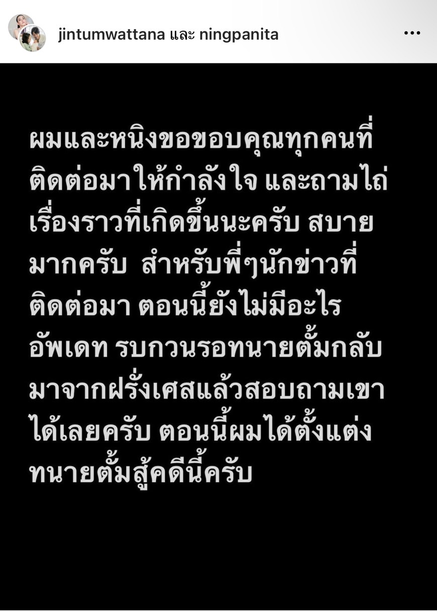 “ผมและหนิงขอขอบคุณทุกคนที่ติดต่อมาให้กำลังใจ และถามไถ่เรื่องราวที่เกิดขึ้นนะครับ สบายมากครับ สำหรับพี่ๆนักข่าวที่ติดต่อมา ตอนนี้ยังไม่มีอะไรอัพเดท รบกวนรอทนายตั้มกลับมาจากฝรั่งเศสแล้วสอบถามเขาได้เลยครับ ตอนนี้ผมได้ตั้งแต่งทนายตั้มสู้คดีนี้ครับ”