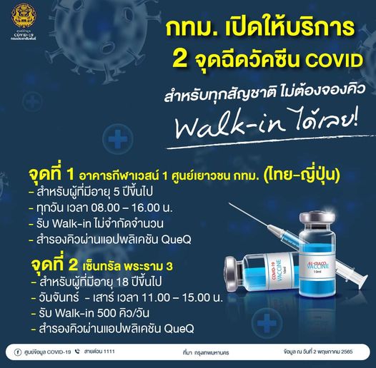 กรุงเทพมหานคร เปิดให้บริการจุดฉีดวัคซีนโควิด-19 สำหรับประชาชนทุกสัญชาติ โดยไม่ต้องจองคิว สามารถ Walk-in ได้เลย โดยจุดแรก ที่อาคารกีฬาเวสน์ 1 ศูนย์เยาวชน กทม. (ไทย-ญี่ปุ่น) สำหรับบุคคลผู้ที่มีอายุ 5 ปีขึ้นไป เปิดให้บริการทุกวัน เวลา 08.00 – 16.00 น. โดยเปิดรับ Walk-in ไม่จำกัดจำนวน บุคคลที่สนใจสามารถสำรองคิวได้ผ่านแอปพลิเคชัน QueQ
