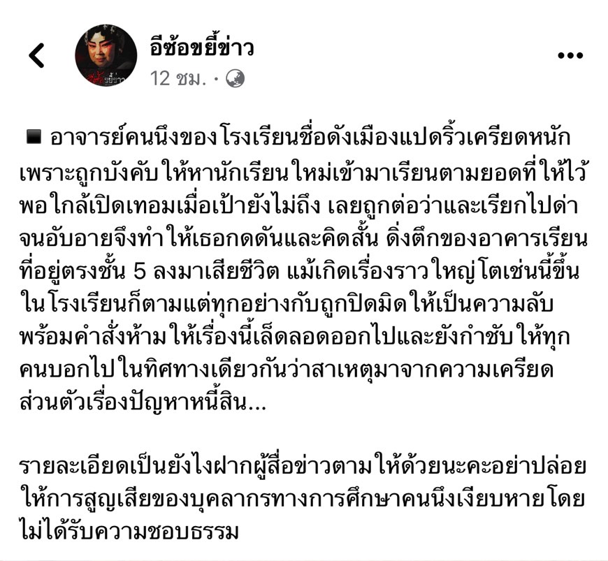 โดยข้อความบนเพจเฟซบุ๊ก “อีซ้อขยี้ข่าว” ระบุว่า “อาจารย์คนนึงของโรงเรียนชื่อดังเมืองแปดริ้วเครียดหนักเพราะถูกบังคับให้หานักเรียนใหม่เข้ามาเรียนตามยอดที่ให้ไว้พอใกล้เปิดเทอมเมื่อเป้ายังไม่ถึง เลยถูกต่อว่าและเรียกไปด่าจนอับอายจึงทำให้เธอกดดันและคิดสั้น ดิ่งตึกของอาคารเรียนที่อยู่ตรงชั้น 5 ลงมาเสียชีวิต แม้เกิดเรื่องราวใหญ่โตเช่นนี้ขึ้นในโรงเรียนก็ตามแต่ทุกอย่างกับถูกปิดมิดให้เป็นความลับ พร้อมคำสั่งห้ามให้เรื่องนี้เล็ดลอดออกไปและยังกำชับให้ทุกคนบอกไปในทิศทางเดียวกันว่าสาเหตุมาจากความเครียดส่วนตัวเรื่องปัญหาหนี้สิน…