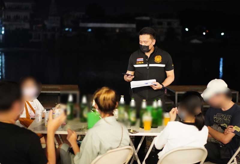 นั่งดื่มกินสังสรรค์เต็มพื้นที่ลานกว้าง โดยมีนายอัฒวุฒิ (สงวนนามสกุล) , นายสายชล (สงวนนามสกุล) และ นางสาว สุวิมล (สงวนนามสกุล) แสดงตนเป็นผู้จัดการร้าน ซึ่งประกอบกิจการในนามบริษัทแห่งหนึ่ง