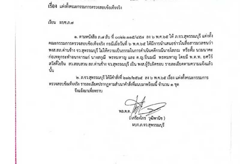 พล.ต.ท.ธนายุตม์ วุฒิจรัสธำรงค์ ผู้บัญชาการตำรวจภูธรภาค 7 เปิดเผยว่า พล.ต.ต.เกรียงไกร วุฒิพานิช ผู้บังคับการตำรวจภูธรจังหวัดสุพรรณบุรี ได้มีหนังสือคำสั่งที่ 212/2565 ลงวันที่ 6 พ.ค.65 แต่งตั้งคณะกรรมการตรวจสอบข้อเท็จจริง