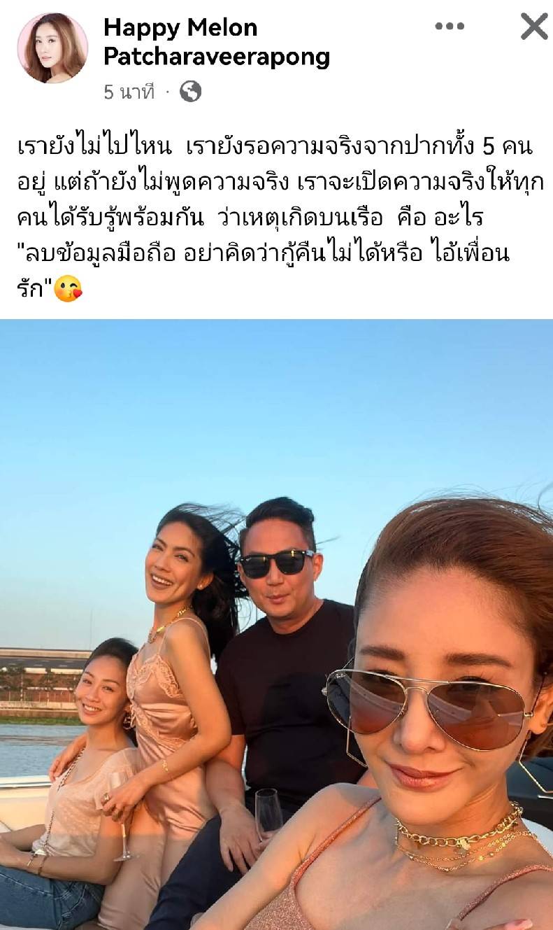 ผู้สื่อข่าวรายงานว่า มีความเคลื่อนไหวในเพจเฟซบุ๊ก “Happy Melon Patcharaveerapong” ซึ่งเป็นเพจเฟซบุ๊กของ แตงโม ภัทรธิดา พัชรวีระพงษ์ ดารานักแสดงสาวชื่อดังที่เสียชีวิตไปโดยพบว่าภาพล่าสุดเป็น ภาพเซลฟี่กันถ่ายบนเรือสปี๊ทโบ๊ทที่มีแซน กระติก ปอ และแตงโม ในท่าทางยิ้มแย้มแจ่มใส พร้อมกับข้อความระบุว่า