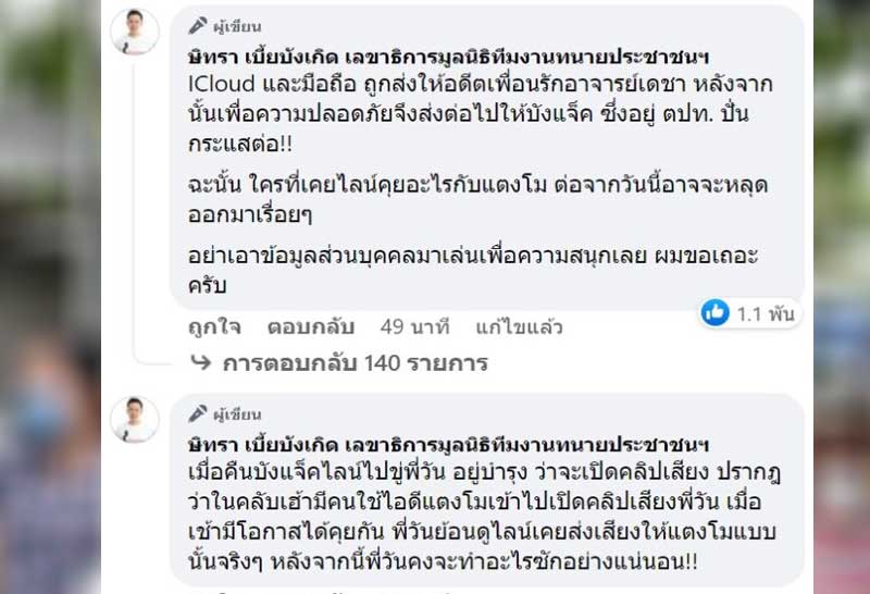 จากนั้น ไอจีของบังแจ็คมาตอบคอมเมนต์ว่า “เอาเพจเราไปเลยครับ” และมีการสนทนาตอบกลับจากแตงโม ว่า “หนูใช้เฟซพี่ได้ ใช่ไหมคะ?” แล้วนอกจากนี้ ลักษณะการใช้ภาษา เหมือนกันที่บังแจ็ค ส่งข้อความไปข่มขู่ สส.วัน อยู่บำรุงเลย ตนมองว่านี่คือหลักฐานชัดเจนว่าเป็นบังแจ็ค ลักษณะเป็นการพิมพ์เองตอบเอง ส่วนตัวมองว่าวัตถุประสงค์ที่ออกมาทำแบบนี้ เพราะต้องการหาแสงและปั่นป่วนคดี ไม่ได้อยากจะมาช่วยเหลือจริง ๆ เพราะผ้าขาวที่บอกจะส่งมาให้นั้น ก็ยังส่งมาไม่ถึงประเทศไทยเลย
