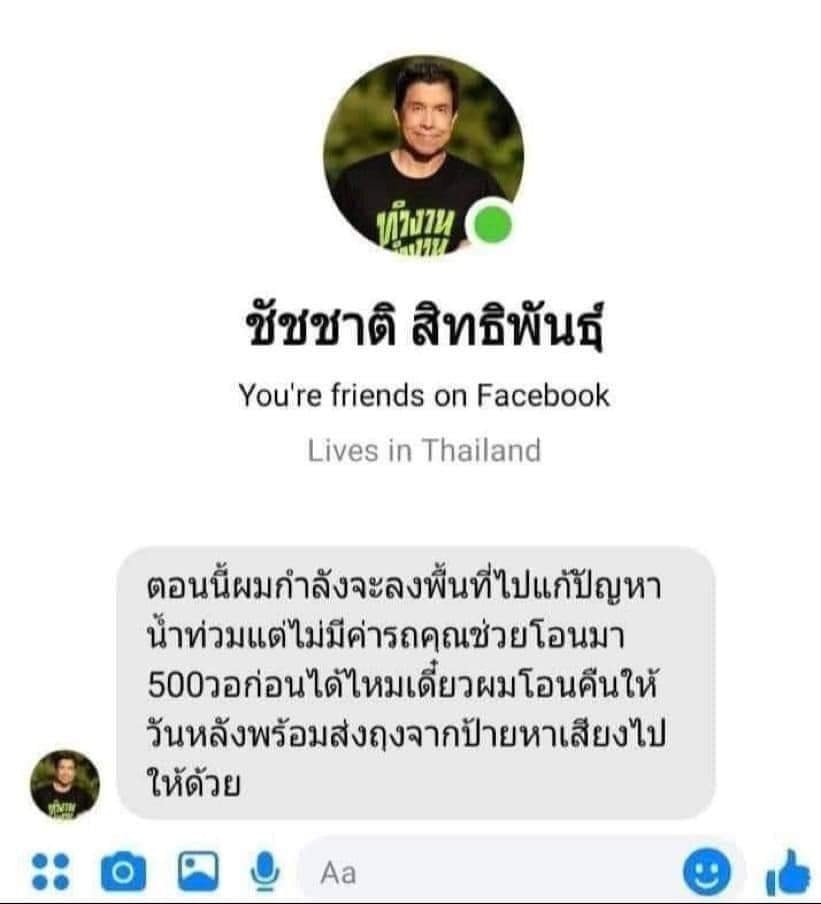 “ตอนนี้ผมกำลังจะลงพื้นที่ไปแก้ไขปัญหาน้ำท่วมแต่ไม่มีค่ารถคุณช่วยโอนมา 500 วอก่อนได้ไหมเดี๋ยวผมโอนคืนให้วันหลังพร้อมส่งถุงจากป้ายหาเสียงไปให้ด้วย”
