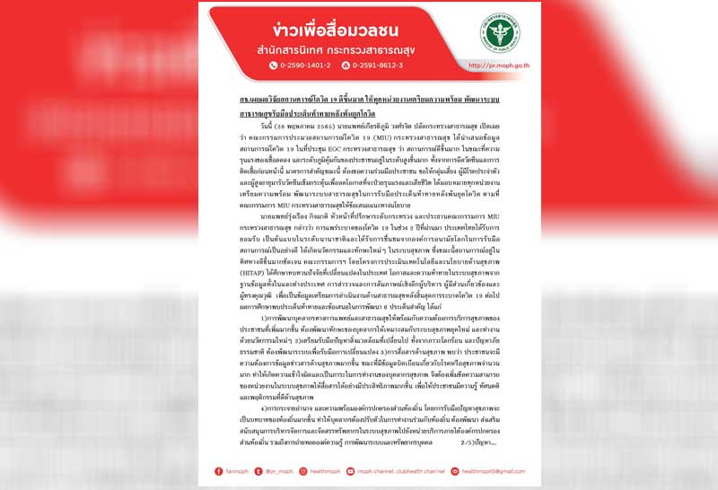 ผู้มีโรคประจำตัวและผู้สูงอายุมารับวัคซีนเข็มกระตุ้นเพื่อลดโอกาสที่จะป่วยรุนแรง และเสียชีวิต ได้มอบหมายทุกหน่วยงานเตรียมความพร้อม พัฒนาระบบสาธารณสุขในการรับมือประเด็นท้าทายหลังพ้นยุคโควิด ตามที่ คณะกรรมการ MIU กระทรวงสาธารณสุขให้ข้อเสนอแนะทางนโยบาย
