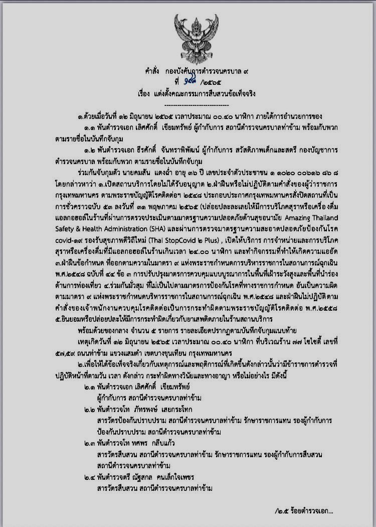 พล.ต.ต.พงศ์อานันต์ คล้ายคลึง ผบก.น. 9 มีคำสั่งที่ 148 /2565 ลงวันที่ 12 มิ.ย.พ.ศ.65 เรื่อง แต่งตั้งคณะกรรมการสืบสวนข้อเท็จจริง กรณี ตำรวจกองสวัสดิ ภาพเด็กและสตรี หรือ ดส. เข้าตรวจค้นจับกุมสถานที่ร่วมกันจับกุมสถานบันเทิงในพื้นที่ สน.ท่าข้าม ปล่อยนักเที่ยวมั่วสุม เสพยาเสพติด ไม่ปฏิบัติตามมาตรการป้องกันโควิด -19 เพื่อให้ได้ข้อเท็จจริงเกี่ยว กับเหตุการณ์และพฤติการณ์ที่เกิดขึ้นตังกล่าวนั้นว่ามีข้าราชการตำรวจ สน.ท่าข้าม อาทิ พ.ต.อ.เลิศศักดิ์ เขียมทรัพย์ ผกก.สน.ท่าข้าม และตำรวจท่าข้ามรวม 12 นาย กระทำผิดทางวินัยและทางอาญา หรือไม่อย่างไร