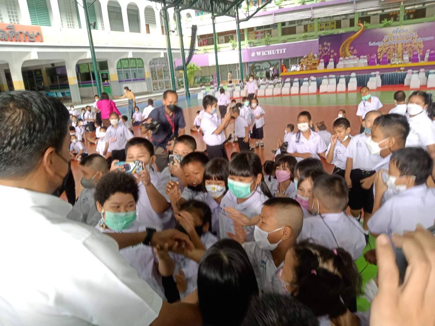 ทั้งนี้ หลังจากให้สัมภาษณ์เสร็จสิ้นผู้ว่าฯ ชัชชาติ ได้ถ่ายรูปร่วมกับคุณครู และเดินทักทายเด็กนักเรียน ซึ่งมีเสียงกรี๊ดกร๊าด และเสียงปรบมือดังสนั่น นักเรียนหลายคนก็ขอจับมือ ชนหมัด และขอเซลฟี่เหมือนเห็นดารา ศิลปินคนมีชื่อเสียงท่านหนึ่ง บางคนก็ขอถ่ายรูปคู่ด้วย แต่ตลอดเวลาที่นายชัชขาติพูดคุยกับเด็ก จะเน้นย้ำไม่ให้ไปยุ่งเกี่ยวกับกัญชาและให้เด็กๆ ตั้งใจเรียนด้วย