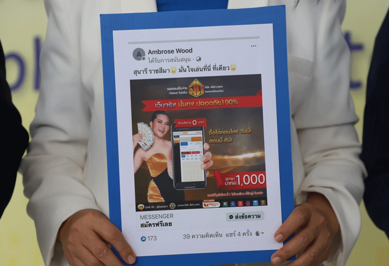 กรณีเว็บพนันนำภาพไปใช้แอบอ้าง ทำให้เกิดความเข้าใจผิดและเกิดความเสียหาย สุนารี เล่าว่าที่เดินทางมาเพราะมีเพจการพนันเอารูปไปแอบอ้าง โดยตนเข้าไปเจอในหน้าเฟซบุ๊กมีการนำภาพไปโฆษณาโปรโมทเว็บพนันออนไลน์ จำนวน 2 เว็บไซต์ ตั้งแต่เมื่อวันที่ 6 กรกฎาคม ที่ผ่านมา