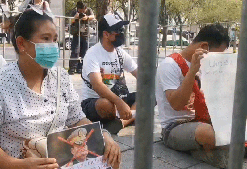 กลุ่มชาวเมียนมาที่อาศัยอยู่ที่ประเทศไทยกว่า 30 คน ทยอยเดินทางมาร่วมตัวบริเวณหน้าองค์การสหประชาชาติ หรือ ยูเอ็น ถนนราชดำเนินนอก เพื่อทำกิจกรรมต่อต้านการยึดอำนาจในประเทศเมียนมา โดยกลุ่มผู้ชุมนุมได้นั่งลงกับพื้น พร้อมถือป้ายกระดาษที่เขียนข้อความต่อต้านการยึดอำนาจ ทั้งภาษาเมียนมาและภาษาอังกฤษ รวมถึงมี ภาพ พล.อ.มิน อ่อง หล่าย ผู้นำการยึดอำนาจ ที่มีการกากบากสีแดงทับ เรียกร้องให้มีการปล่อยตัวนางอองซาน ซูจี คืนประชาธิปไตยให้ประเทศเมียนมา