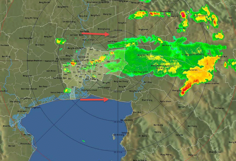 วันที่ 16 สิงหาคม 2565 เวลา 18.00 น. พบกลุ่มฝนเล็กน้อยถึงปานกลางเขตตลิ่งชัน ลาดพร้าว บึงกุ่ม คันนายาว สวนหลวง ประเวศ ลาดกระบัง หนองจอก/ เคลื่อนตัวทิศตะวันออก แนวโน้มคงที่ / ปริมาณฝนสูงสุดเขตหนองจอก 30.5 มม.
