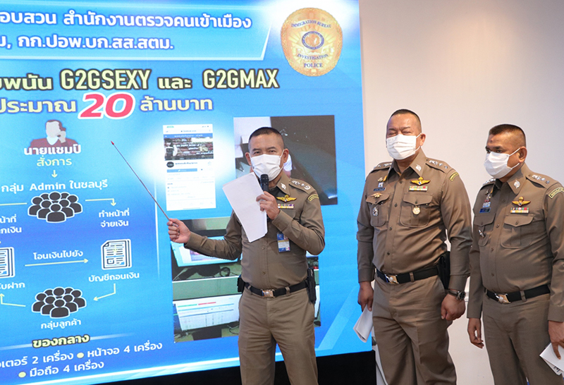 พล.ต.ท.สมพงษ์ ชิงดวง ผู้บัญชาการสำนักงานตรวจคนเข้าเมือง (ผบช.สตม.) แถลงผลการจับกุม นายวีรภัทร อายุ 25 ปี และนายณัฐวุฒิ อายุ 23 ปีพร้อมของกลางเป็นคอมพิวเตอร์ จำนวน 2 เครื่อง หน้าจอคอมพิวเตอร์ จำนวน 4 จอ และโทรศัพท์ที่ผูกกับแอพพลิเคชั่นอินเตอร์เน็ตแบงก์กิ้ง จำนวน 4 เครื่องหลังเจ้าหน้าที่สืบทราบว่ามีการเปิดเว็บไซต์ให้ พนันออนไลน์ ผ่านทางเว็บ G2GSEXY และ G2GMAX พบมีการเปิดให้เล่นการพนันในรูปแบบต่างๆ