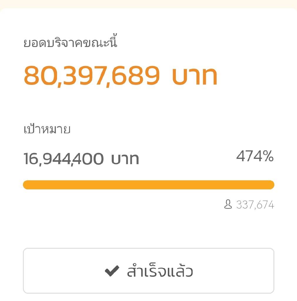 โดยมียอดเงินบริจาคผ่านบัญชีทั้งหมด 80,397,689 บาท เป็นยอดบริจาควันสุดท้ายของโครงการวันเดียวสูงถึง 10 ล้านบาท ถือเป็นการโครงการที่ประสบความสำเร็จเพราะบอกบริจาคเกิดเป้าหมายที่ตั้งไว้ 16,944,400 บาท หรือคิดเป็น 474 %