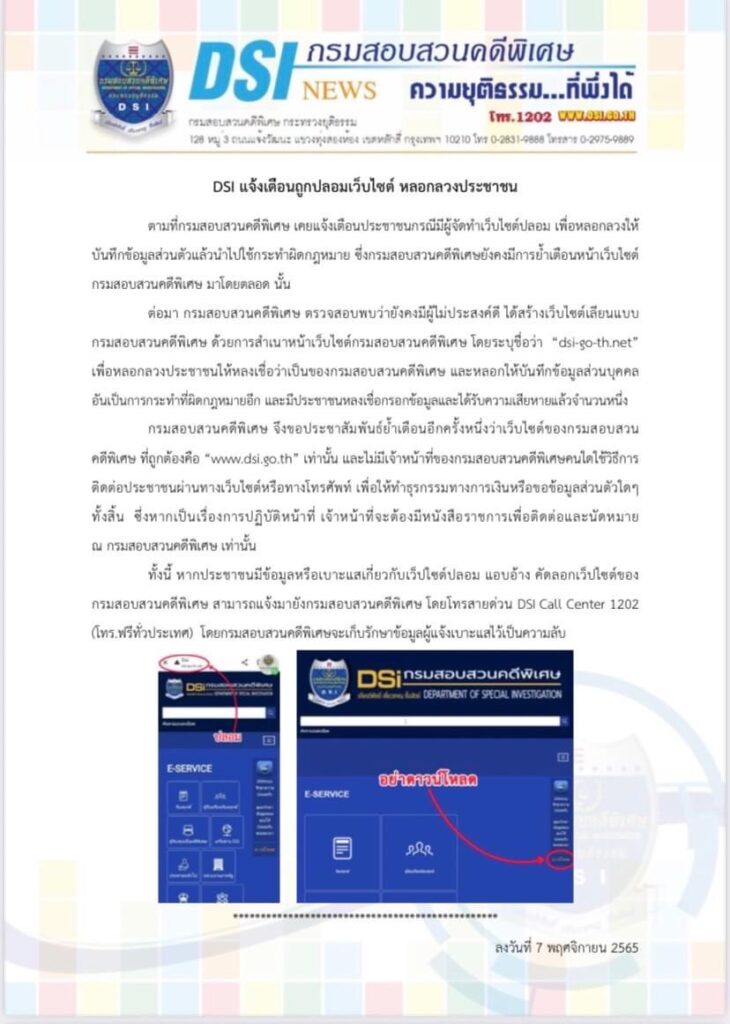 ทางกรมสอบสวนคดีพิเศษ จึงขอประชาสัมพันธ์ย้ำเตือนอีกครั้งหนึ่งว่าเว็บไซต์ที่ถูกต้องคือ “www.dsi.go.th” เท่านั้น และไม่มีเจ้าหน้าที่คนใดใช้วิธีการติดต่อประชาชนผ่านทางเว็บไซต์หรือทางโทรศัพท์ เพื่อให้ทำธุรกรรมทางการเงินหรือขอข้อมูลส่วนตัวใดๆ ทั้งสิ้น ซึ่งหากเป็นเรื่องการปฏิบัติหน้าที่ เจ้าหน้าที่จะต้องมีหนังสือราชการเพื่อติดต่อและนัดหมายเท่านั้น