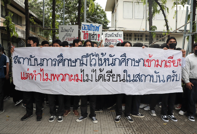 โดยตัวแทนจากสโมสรนักศึกษา เผยว่าทางผู้บริหารและอาจารย์บางท่านออกคําสั่งให้นักศึกษาปีหนึ่งกับปีอื่นบางส่วนเรียนออนไลน์และห้ามเข้ามาภายในสถาบัน ซึ่งนักศึกษาส่วนใหญ่ไม่เข้าใจ เนื่องจากบางวิชาเป็นการเรียนปฏิบัติต้องมีการใช้อุปกรณ์ แต่กลับให้เรียนเป็นทฤษฎีแทน อีกทั้งยังเรียกเก็บค่าเทอมเต็มจํานวนและเคยเขียนคําร้องขอลดหย่อนค่าเทอมแล้วแต่ไม่เป็นผล นอกจากนี้ยังมีบางคนถูกพักการเรียน เพียงแค่เข้ามาส่งงาน และก็มีบางส่วนที่ถูกไล่ออกโดยไม่แจ้งสาเหตุให้นักศึกษาทราบ จึงทําให้ต้องรวมตัวมาประท้วงกันในวันนี้