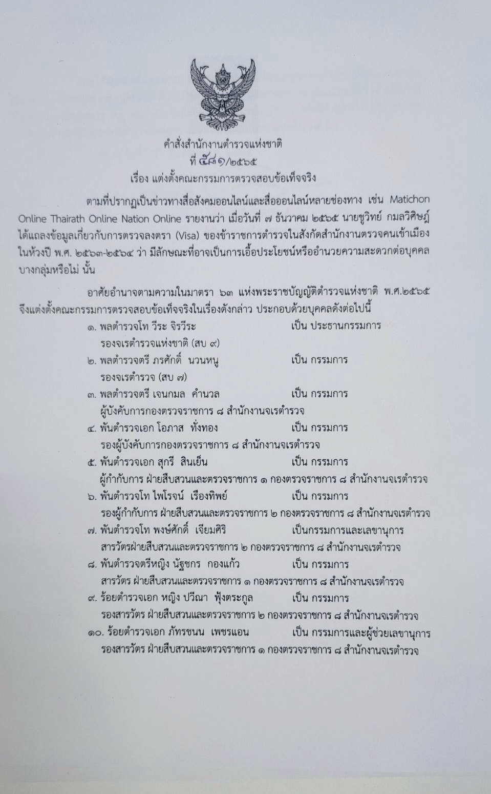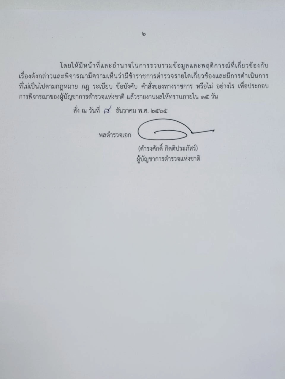 ทั้งนี้ ให้มีหน้าที่และอำนาจในการรวบรวมข้อมูลและพฤติการณ์ที่เกี่ยวข้องกับเรื่องดังกล่าวและ พิจารณามีความเห็นว่ามีข้าราชการตำรวจรายใดเกี่ยวข้องและมีการดำเนินการที่ไม่เป็นไปตามกฎหมาย กฎ ระเบียบ ข้อบังคับ คำสั่งของทางราชการ หรือไม่ อย่างไร เพื่อประกอบการพิจารณาของผู้บัญชาการตำรวจแห่งชาติ แล้วรายงานผลให้ทราบภายใน 15 วัน สั่ง ณ วันที่ 8 ธันวาคม พ.ศ. 2565 ลงนามโดย พลตำรวจเอก ดำรงศักดิ์ กิตติประภัสร์ ผู้บัญชาการตำรวจแห่งชาติ