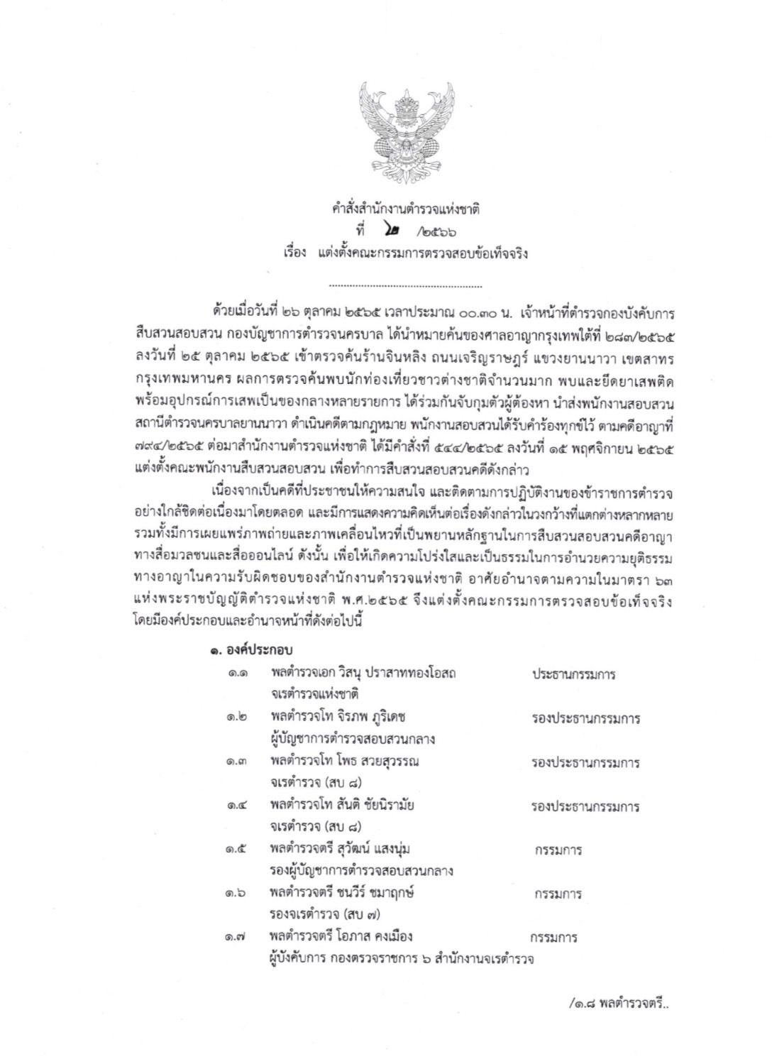 ทางสื่อมวลชนและสื่อออนไลน์ ดังนั้น เพื่อให้เกิดความโปร่งใสและเป็นธรรมในการอำนวยความยุติธรรม ทางอาญาในความรับผิดชอบของสำนักงานตำรวจแห่งชาติ อาศัยอำนาจตามความในมาตรา 63 แห่งพระราชบัญญัติตำรวจแห่งชาติ พ.ศ.2565 จึงแต่งตั้งคณะกรรมการตรวจสอบข้อเท็จจริง โดยมีองค์ประกอบและอำนาจหน้าที่ดังต่อไปนี้