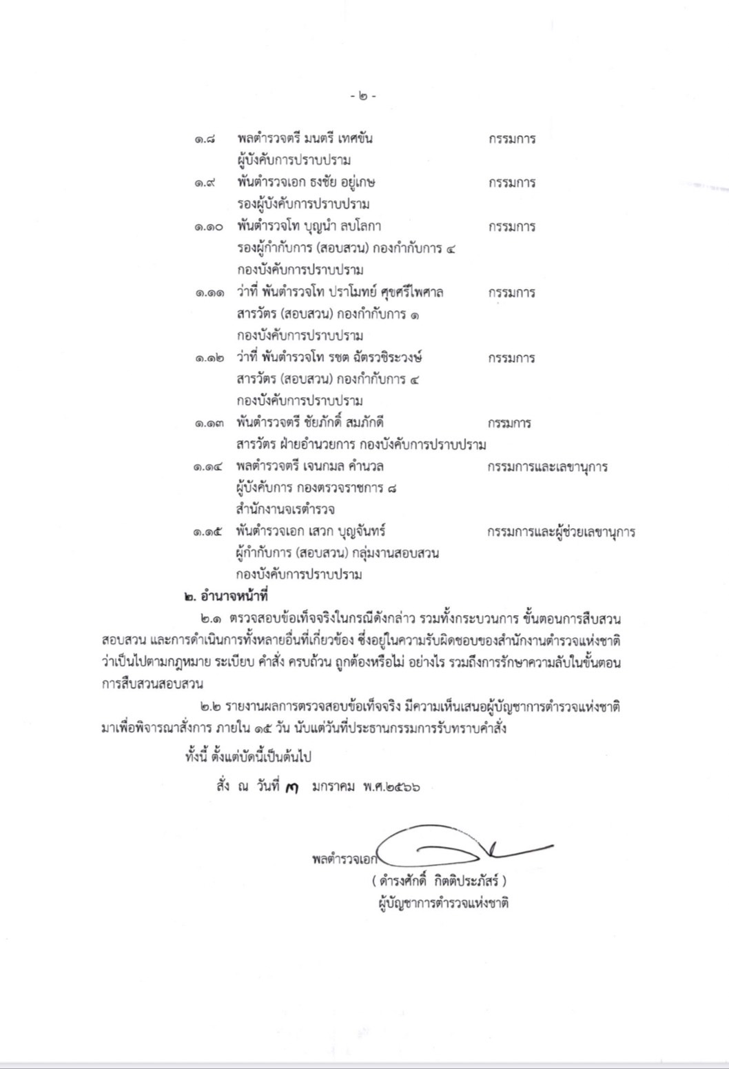 วันที่ 4 มกราคม 2566 พล.ต.อ.ดำรงศักดิ์ กิตติประภัสร์ ผู้บัญชาการตำรวจแห่งชาติ (ผบ.ตร.) ลงนามในคําสั่งสํานักงานตำรวจแห่งชาติ ที่ 2/2566 เรื่อง แต่งตั้งคณะกรรมการตรวจสอบข้อเท็จจริง