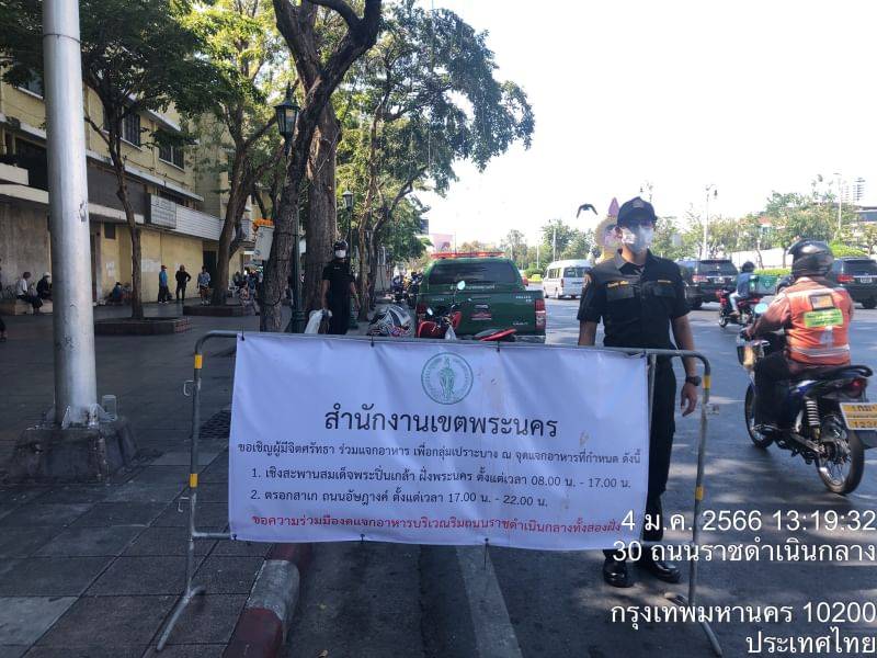 กรุงเทพมหานคร โดย สำนักงานเขตพระนคร บูรณาการร่วมกับตำรวจสน.ชนะสงคราม และ สน.สำราญราษฏร์ และสำนักพัฒนาสังคม กทม. และหน่วยงานภาคีเครือข่าย ดำเนินการจัดระเบียบบริเวณถนนราชดำเนินกลาง โดยจัดเจ้าหน้าที่เทศกิจดำเนินการประชาสัมพันธ์ให้งดการแจกจ่ายอาหารให้แก่คนไร้บ้านบริเวณถนนราชดำเนิน พร้อมทั้งอำนวยความสะดวกให้แจกจ่ายอาการในจุดบริการที่จัดไว้บริเวณใกล้เคียง เพื่อความสะอาดและเป็นระเบียบเรียบร้อย